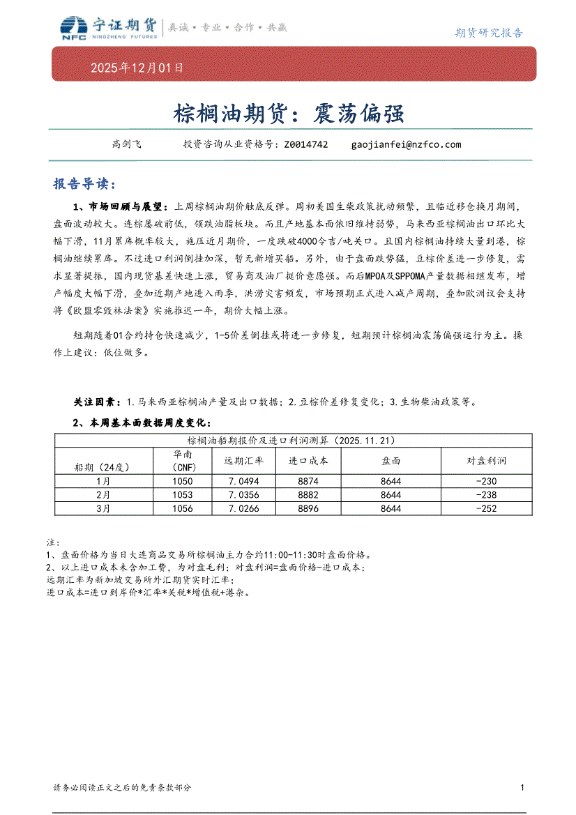 宁证期货-棕榈油期货:震荡偏弱-251215