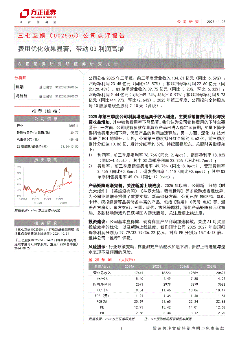 三七互娱:方正证券-三七互娱-002555-公司点评报告:费用优化效果显著,带动Q3利润高增-251102