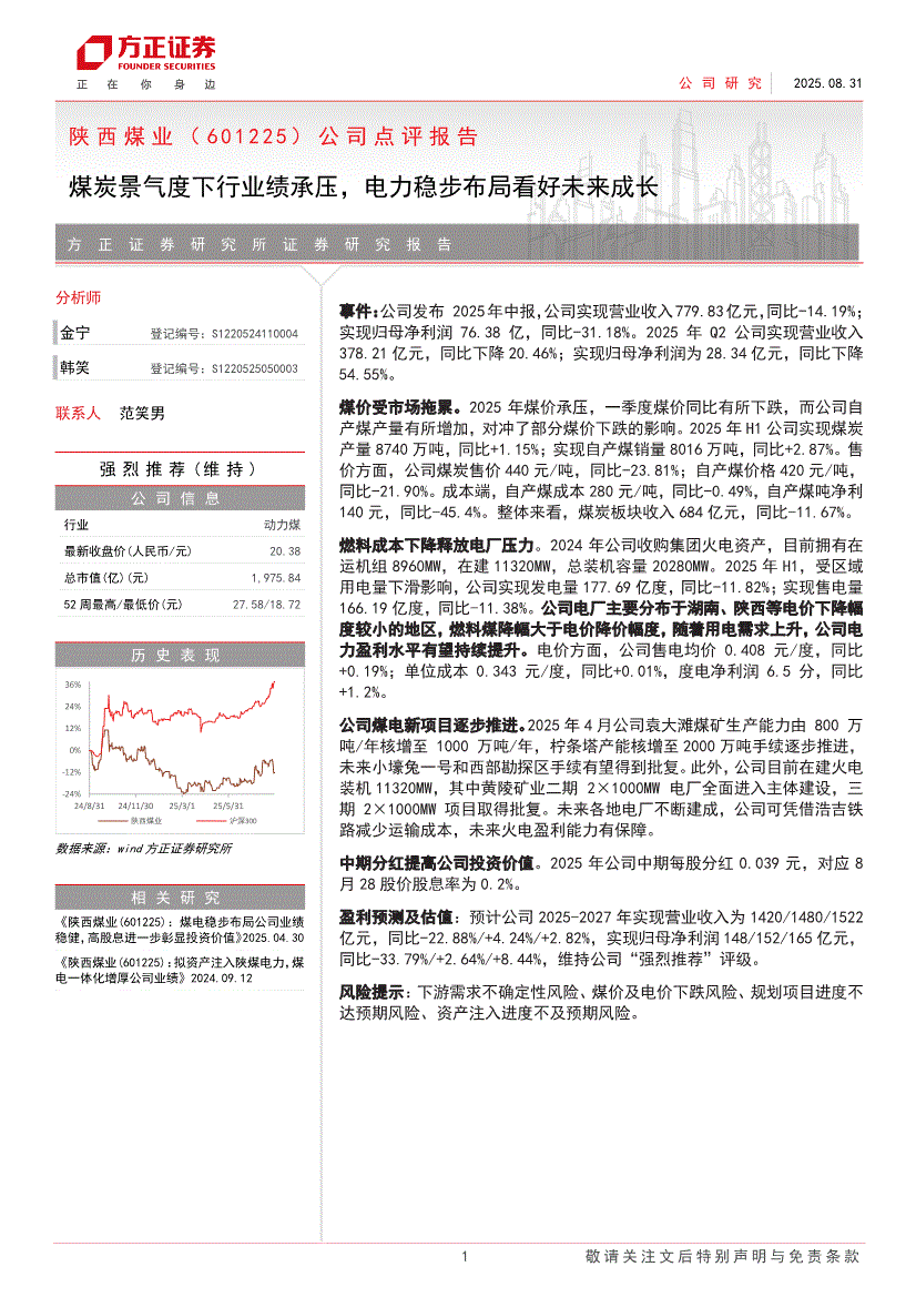 陕西煤业:方正证券-陕西煤业-601225-公司点评报告:煤炭景气度下行业绩承压,电力稳步布局看好未来成长-250831