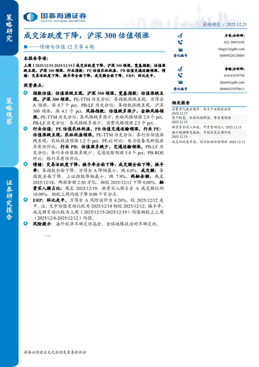 国泰海通证券-情绪与估值12月第4期:成交活跃度下降,沪深300估值领涨-251221