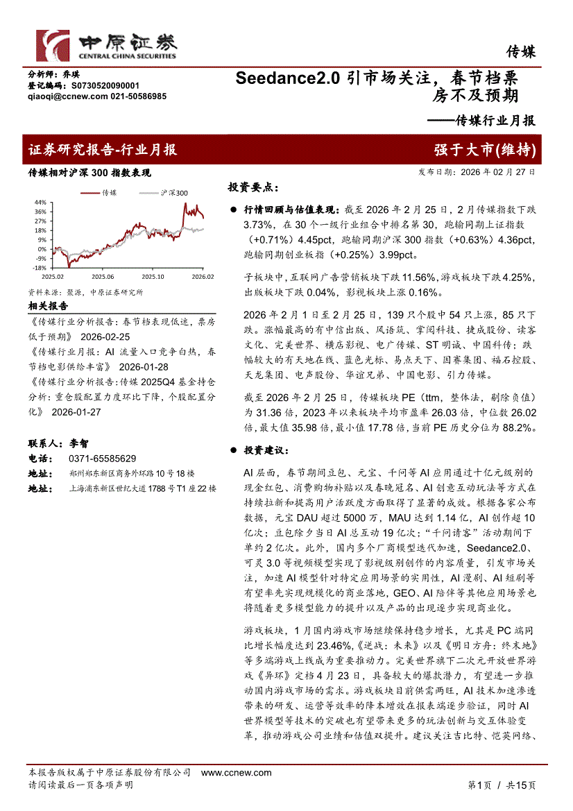 传媒行业:中原证券-传媒行业月报:Seedance2.0引市场关注,春节档票房不及预期-260227