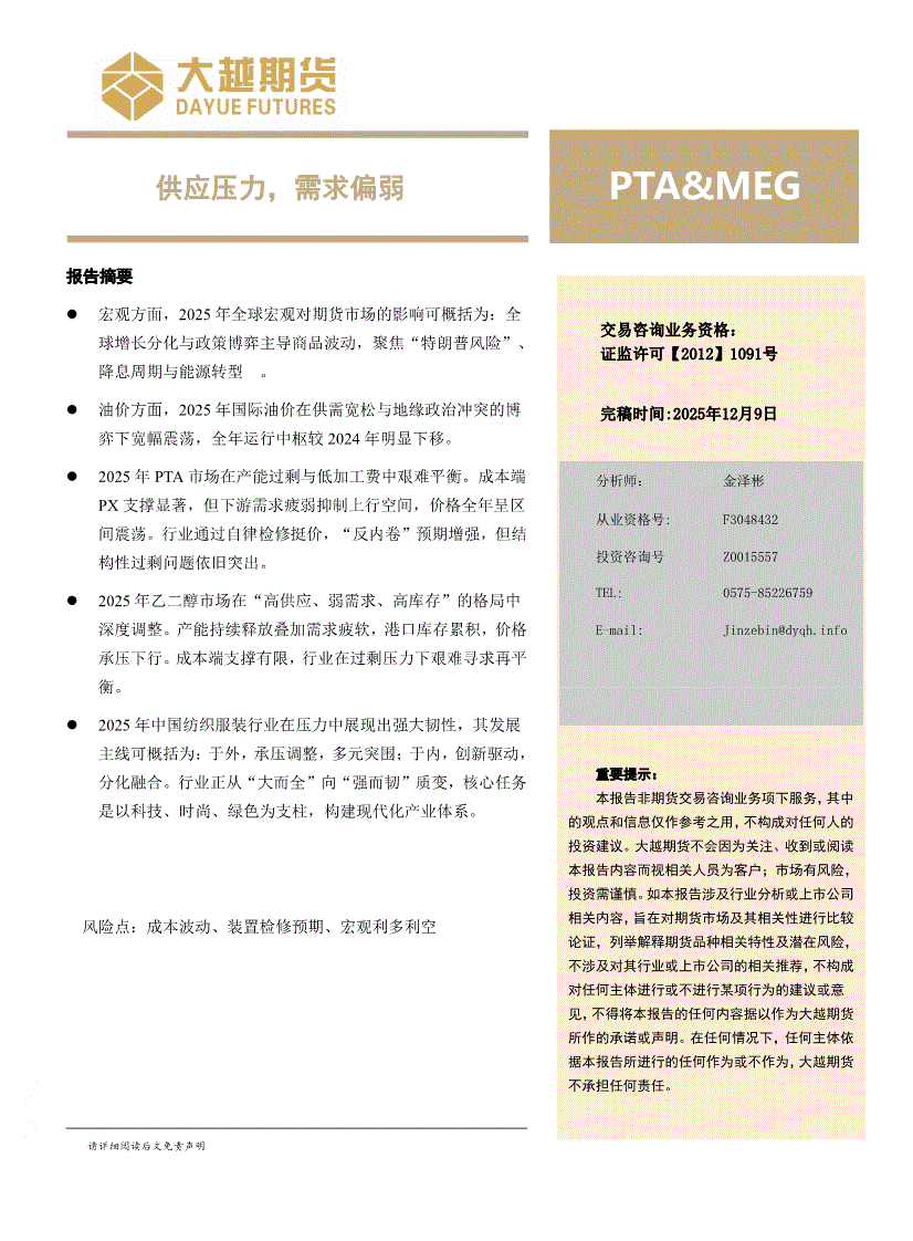 大越期货-PTA&MEG:供应压力,需求偏弱-251209