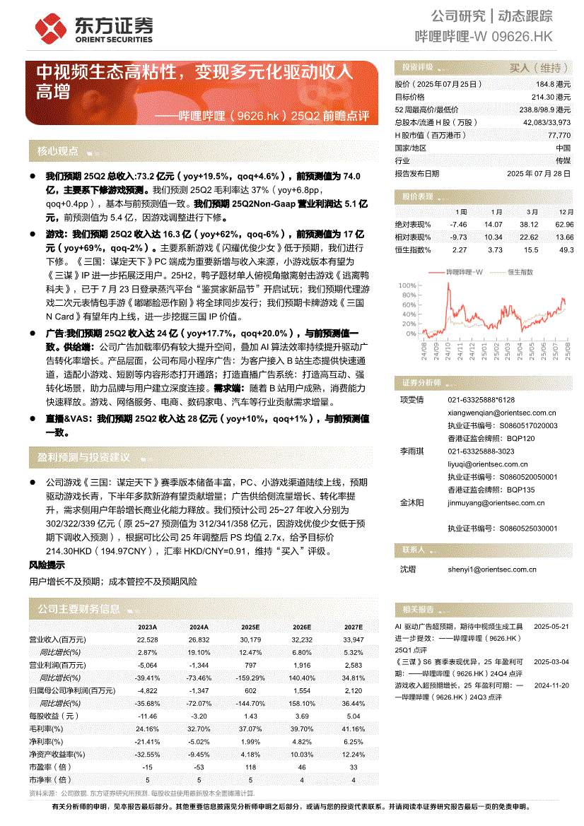 哔哩哔哩~W:东方证券-哔哩哔哩~W-9626.HK-25Q2前瞻点评:中视频生态高粘性,变现多元化驱动收入高增-250728