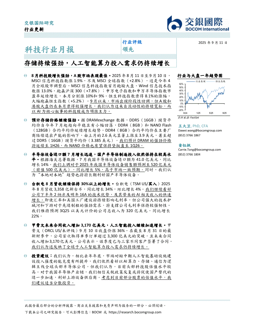 科技行业:交银国际-科技行业月报:存储持续强劲,人工智能算力投入需求仍持续增长-250911