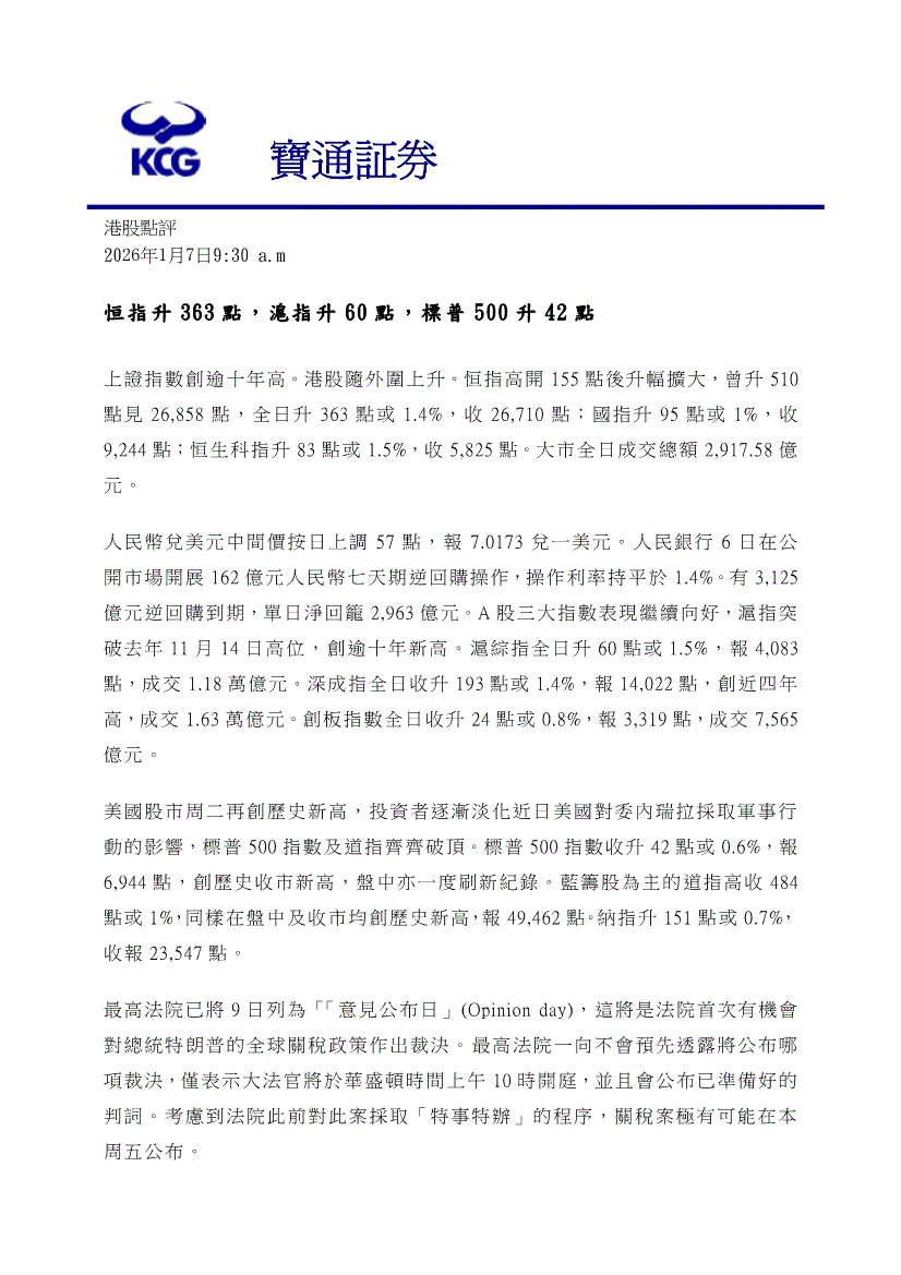 宝通证券-港股点评:恒指升363点,沪指升60点,标普500升42点-260107