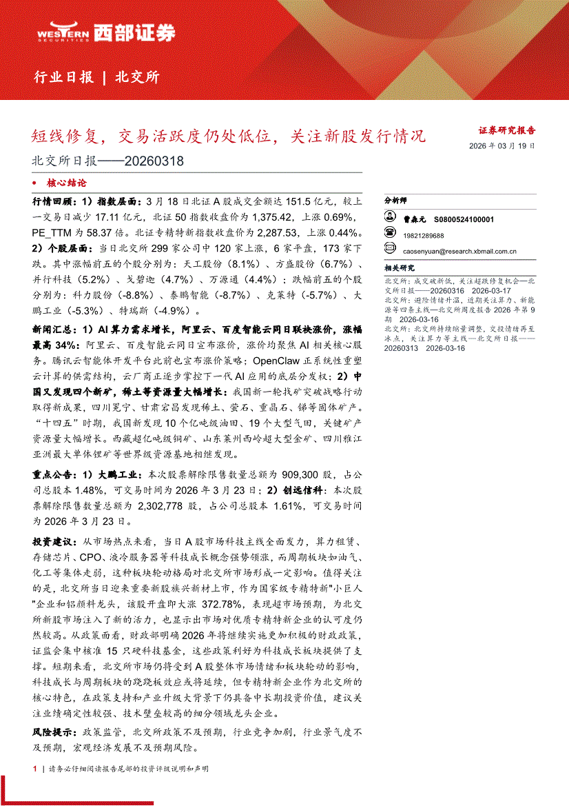 西部证券-北交所日报:短线修复,交易活跃度仍处低位,关注新股发行情况-260319