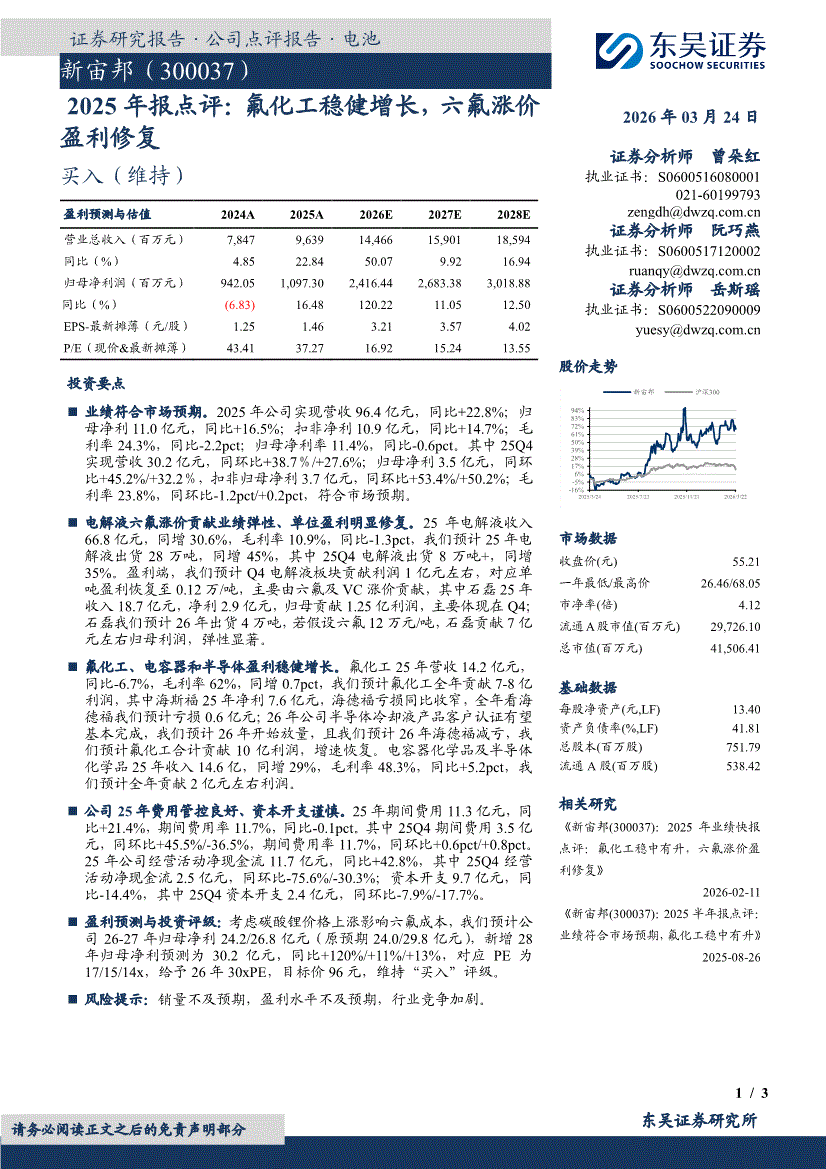 新宙邦:东吴证券-新宙邦-300037-2025年报点评:氟化工稳健增长,六氟涨价盈利修复-260324