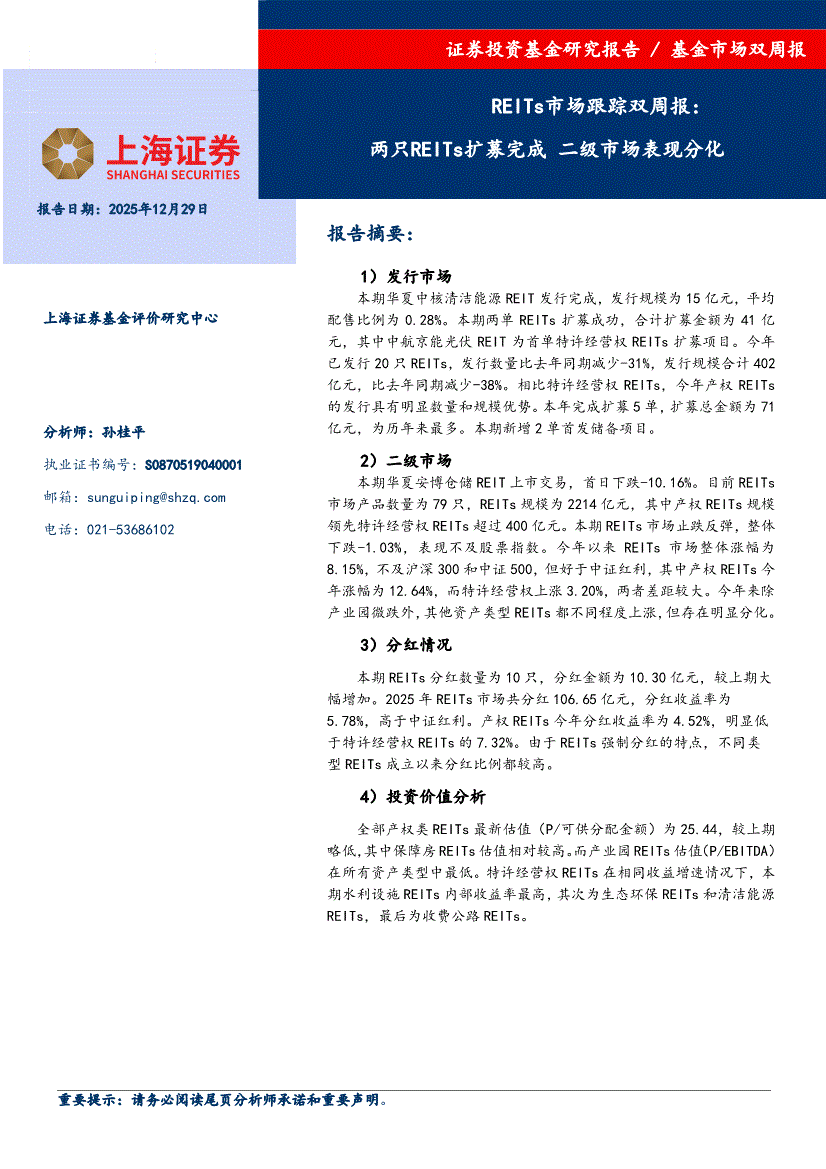 上海证券-REITs市场跟踪双周报:两只REITs扩募完成,二级市场表现分化-251229