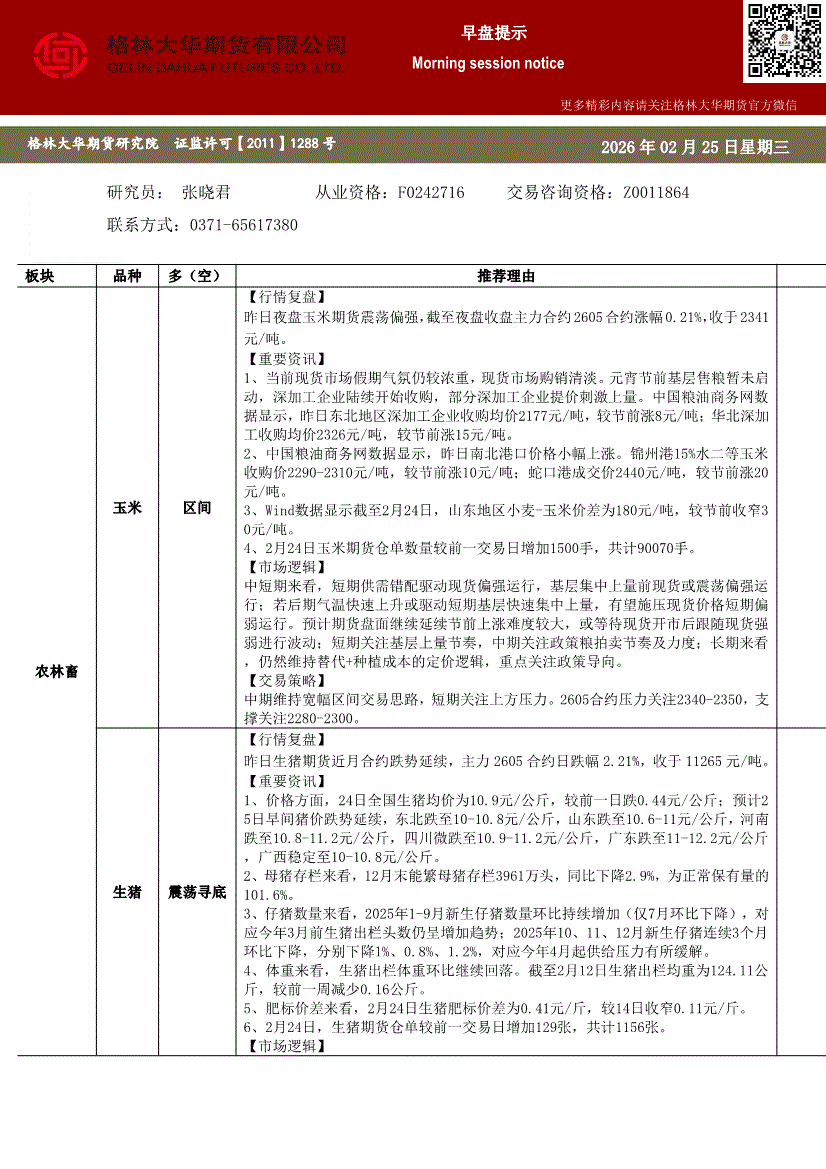 格林大华期货-早盘提示~玉米生猪鸡蛋-260225