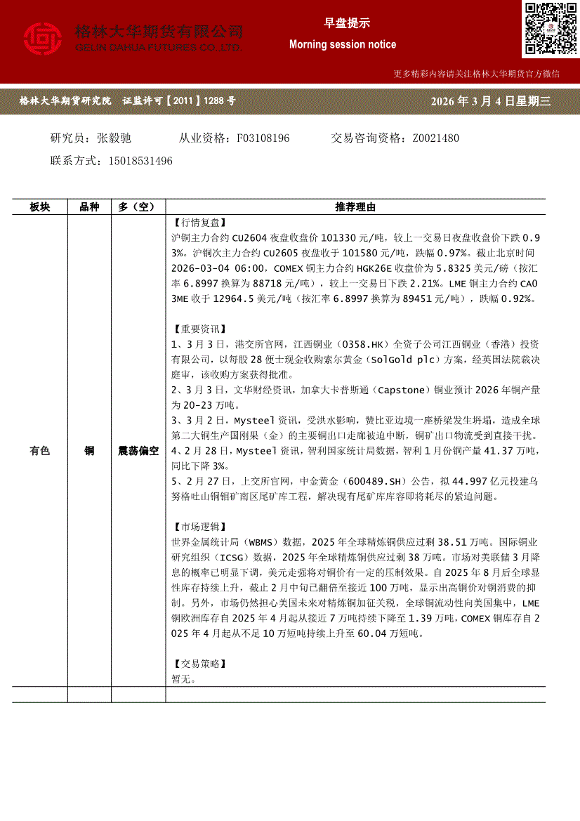 格林大华期货-早盘提示:铜-260302