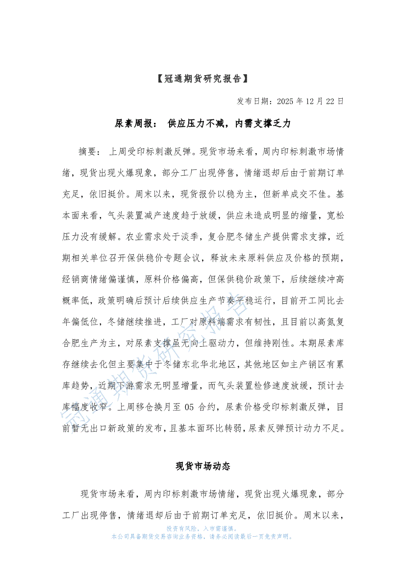 冠通期货-尿素周报:供应压力不减,内需支撑乏力-251222