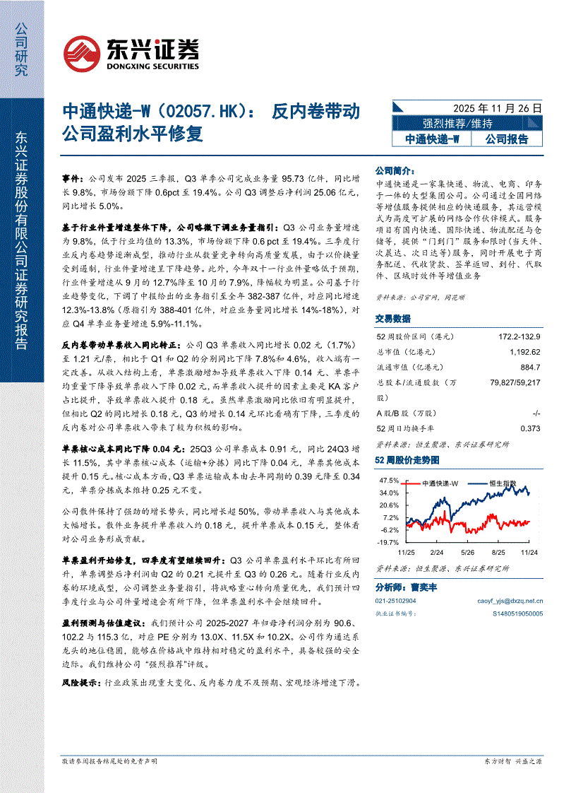 中通快递~W:东兴证券-中通快递~W-2057.HK-反内卷带动公司盈利水平修复-251126