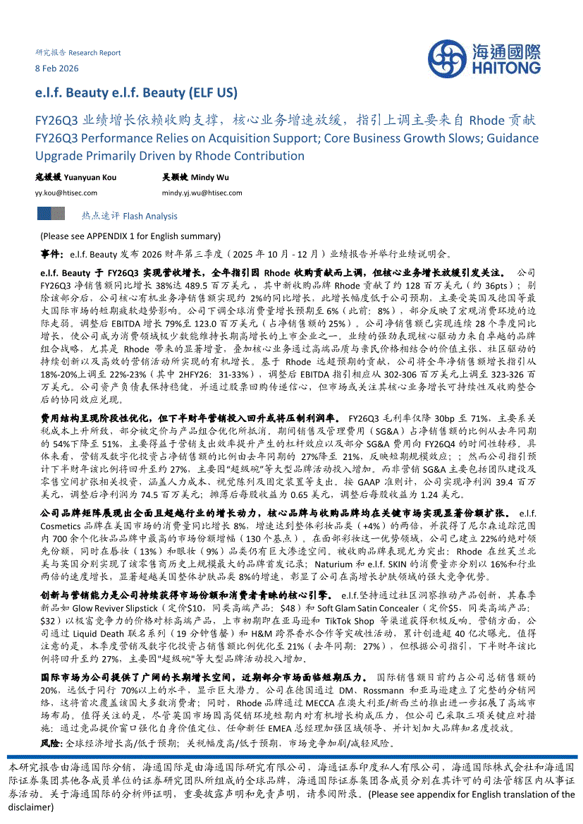 e.l.f. Beauty:海通国际-e.l.f. Beauty-ELF.US-FY26Q3业绩增长依赖收购支撑,核心业务增速放缓,指引上调主要来自Rhode贡献-260208