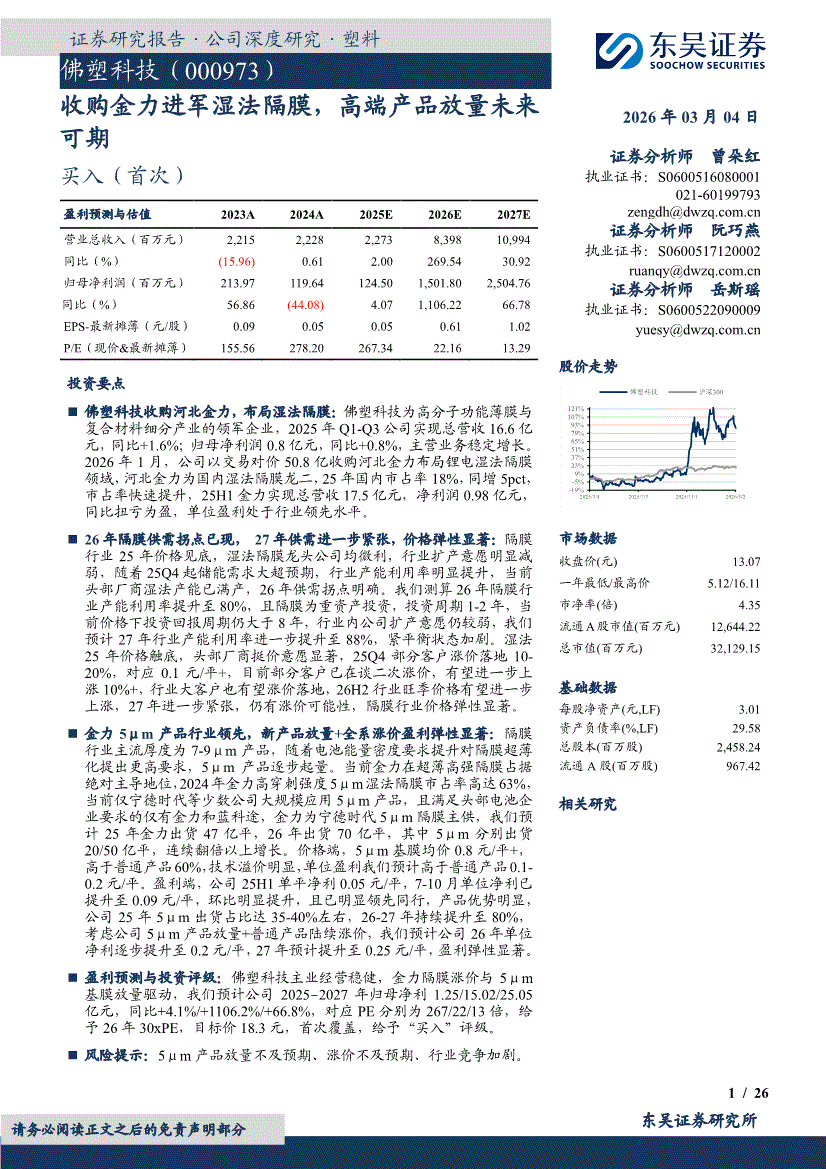佛塑科技:东吴证券-佛塑科技-000973-收购金力进军湿法隔膜,高端产品放量未来可期-260304