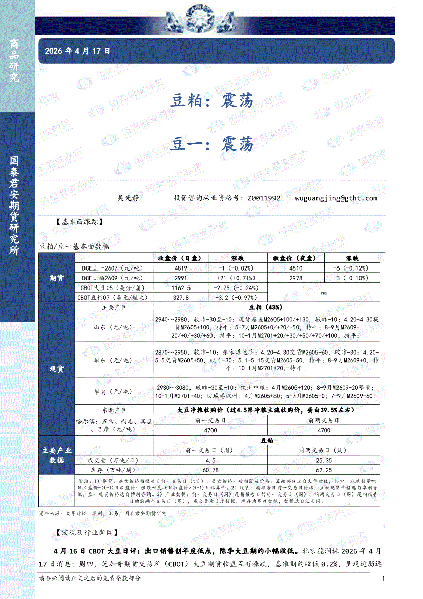 国泰君安期货-豆粕:震荡,豆一,震荡-260417