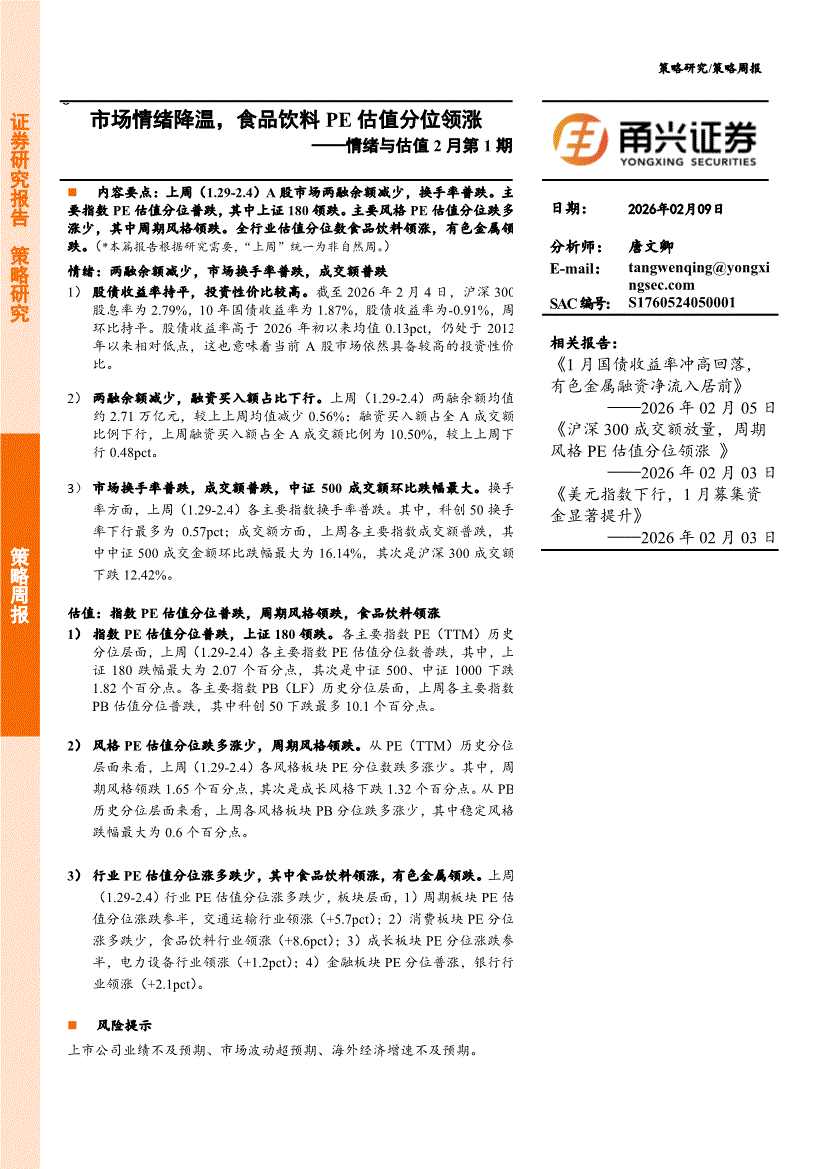 甬兴证券-情绪与估值2月第1期:市场情绪降温,食品饮料PE估值分位领涨-260209