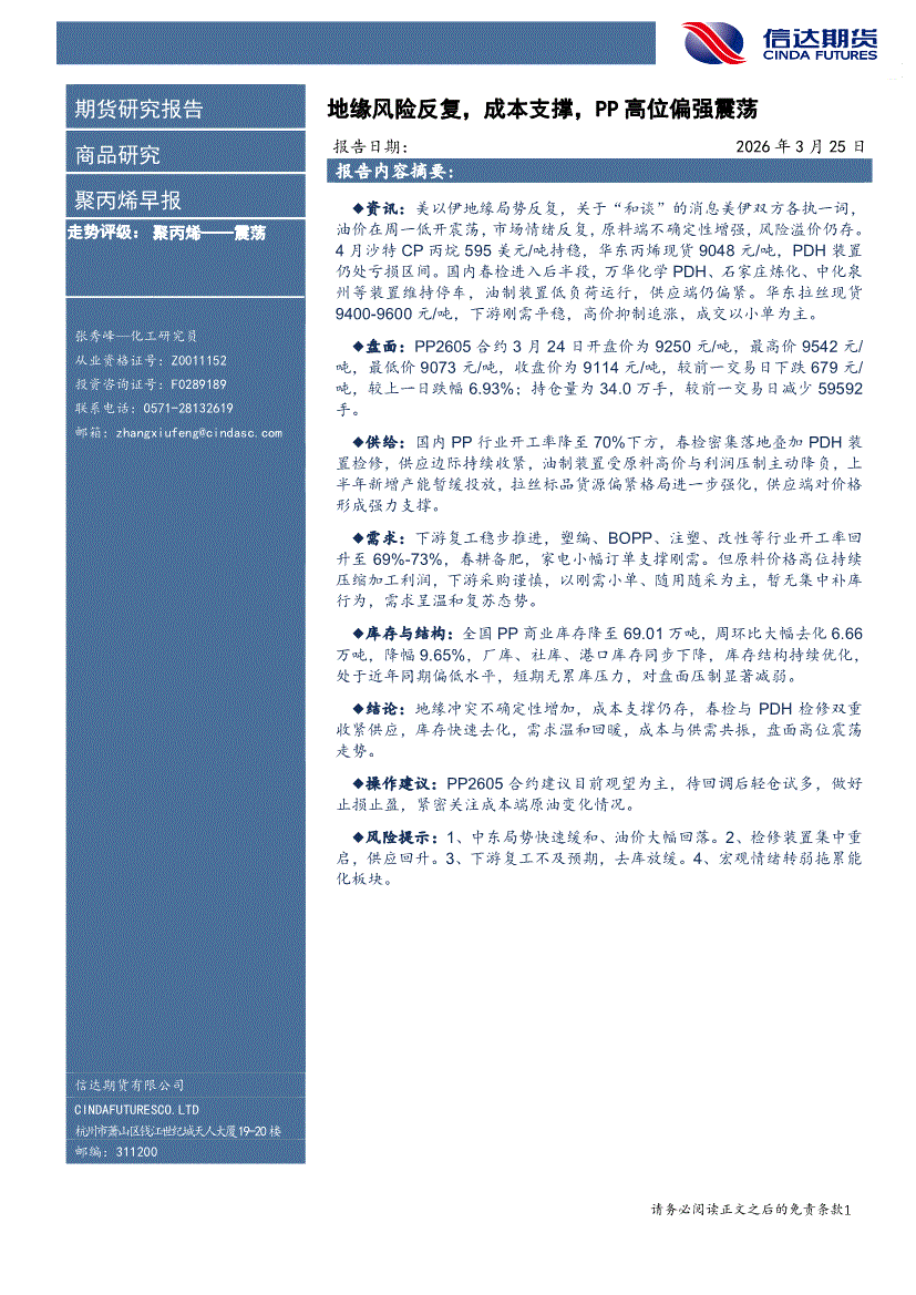 信达期货-聚丙烯早报:地缘风险反复,成本支撑,PP高位偏强震荡-260325