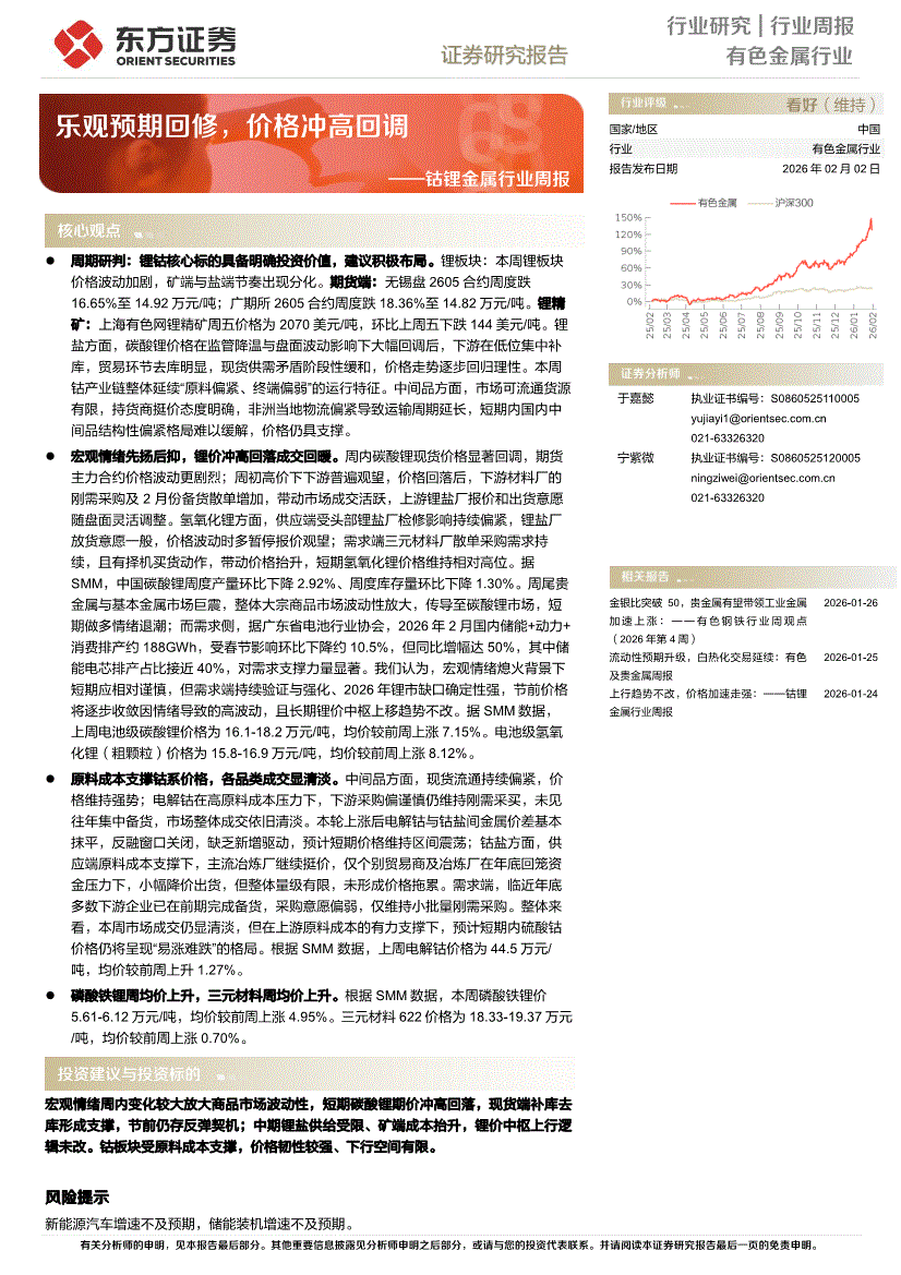 钴锂金属行业:东方证券-钴锂金属行业周报:乐观预期回修,价格冲高回调-260202