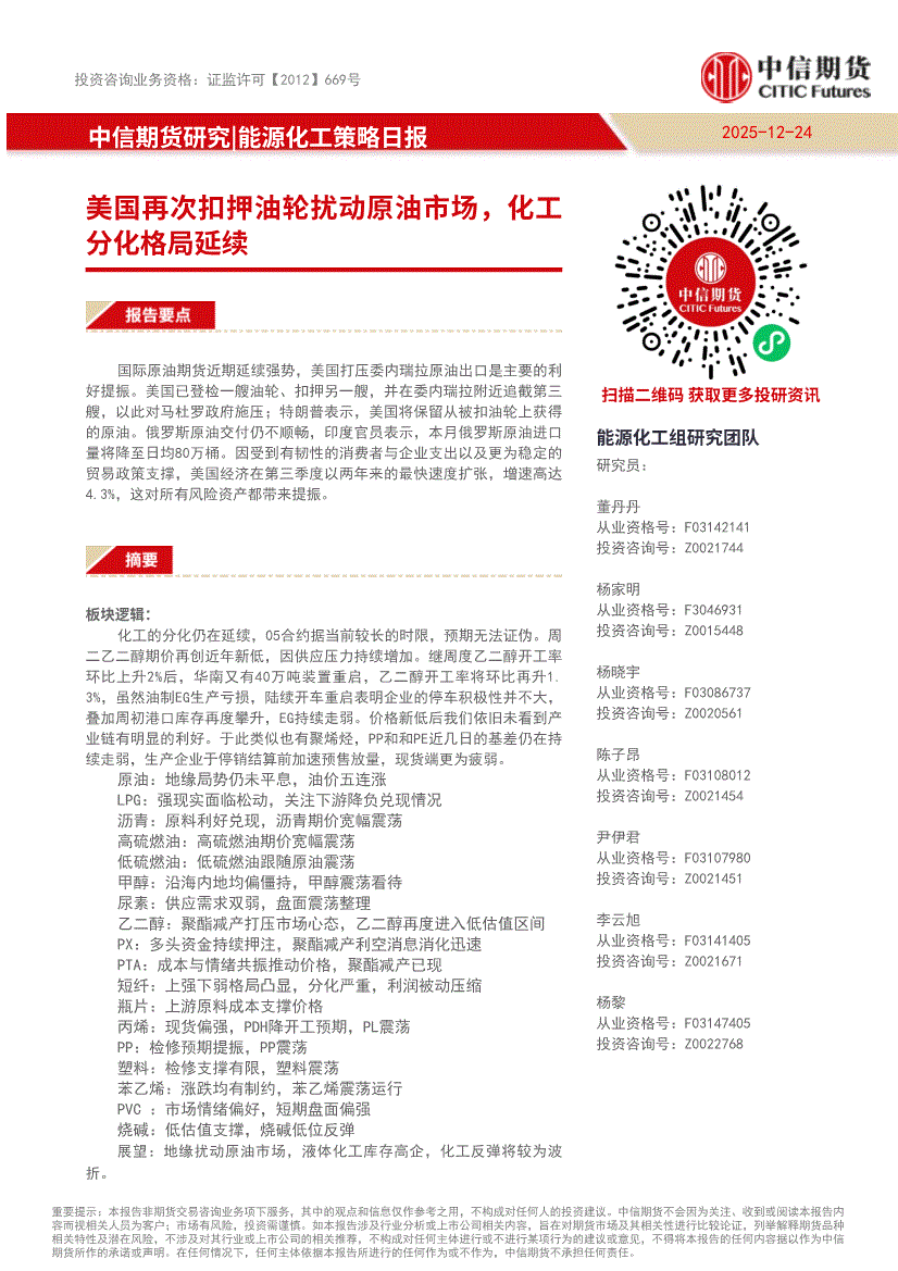 中信期货-能源化工策略日报:美国再次扣押油轮扰动原油市场,化工分化格局延续-251224