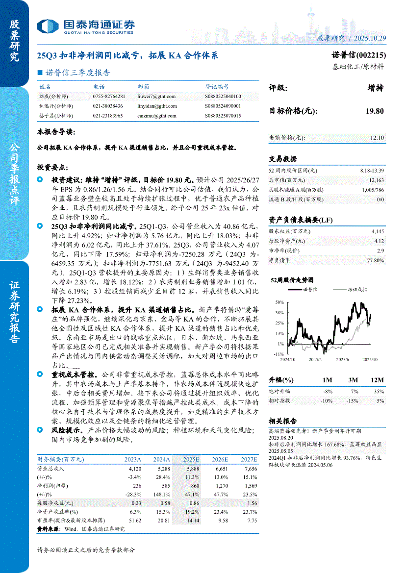 诺普信:国泰海通证券-诺普信-002215-三季度报告:25Q3扣非净利润同比减亏,拓展KA合作体系-251029
