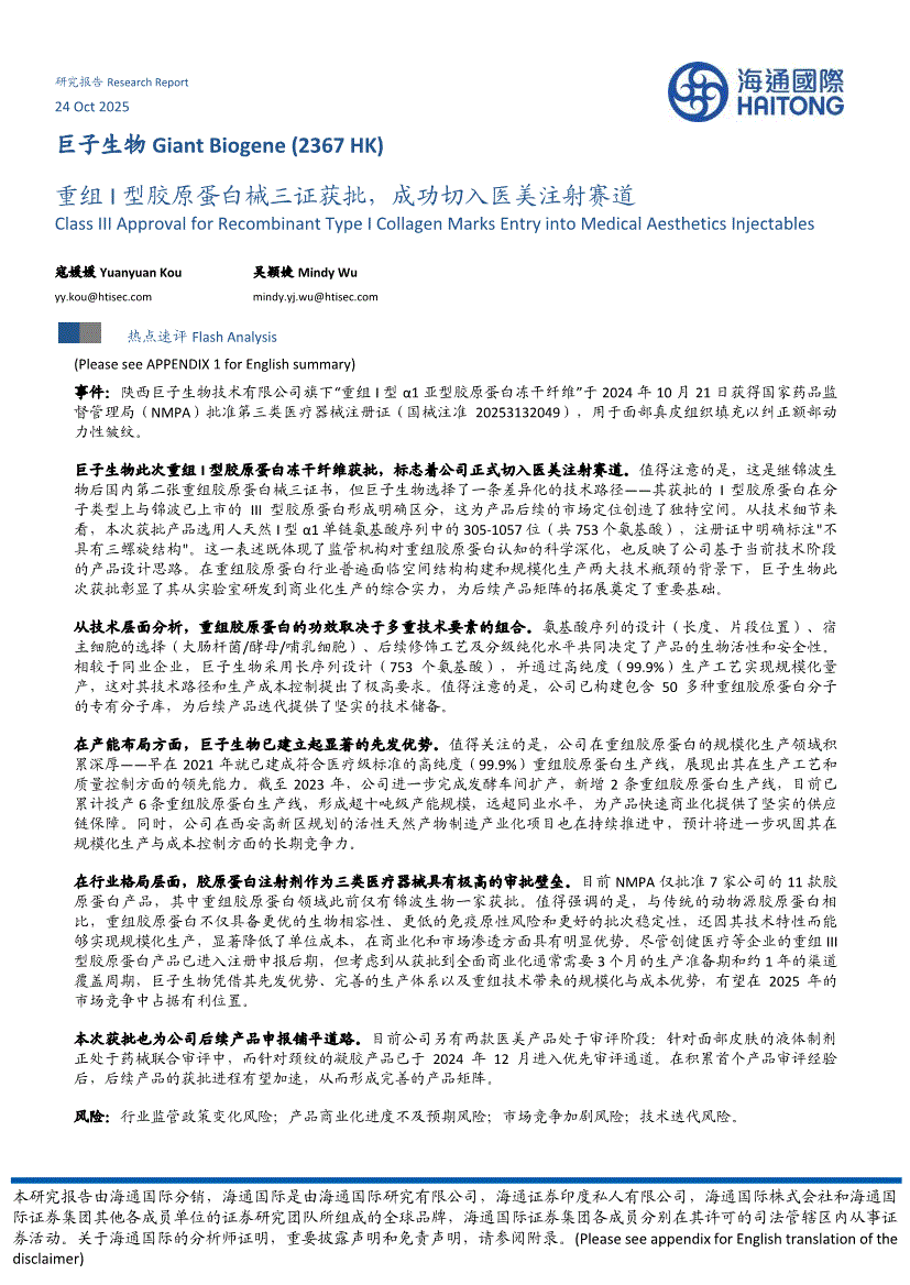 巨子生物:海通国际-巨子生物-2367.HK-重组I型胶原蛋白械三证获批,成功切入医美注射赛道-251024