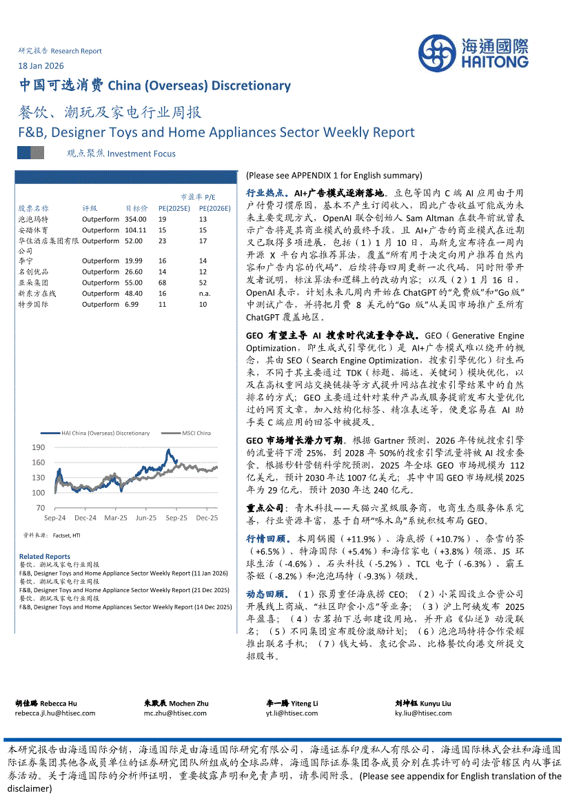 餐饮、潮玩及家电行业:海通国际-餐饮、潮玩及家电行业周报-260118