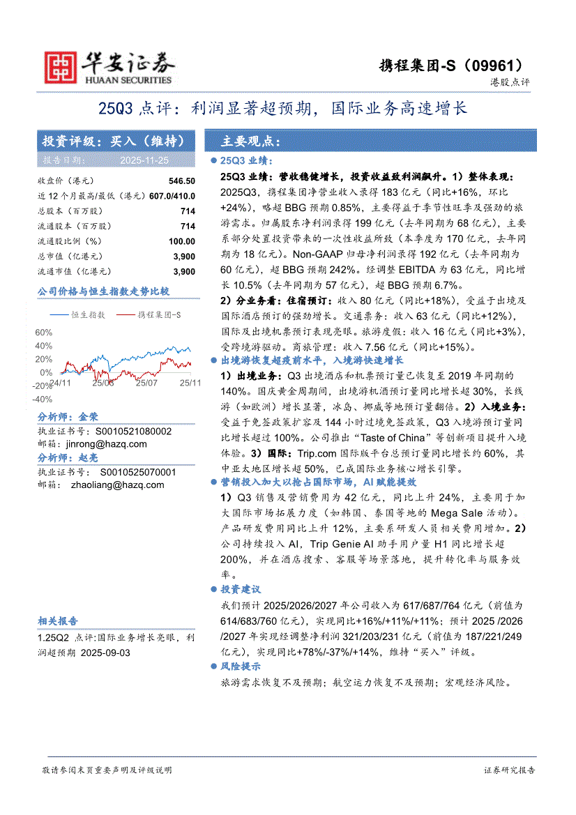携程集团~S:华安证券-携程集团~S-9961.HK-25Q3点评:利润显著超预期,国际业务高速增长-251125