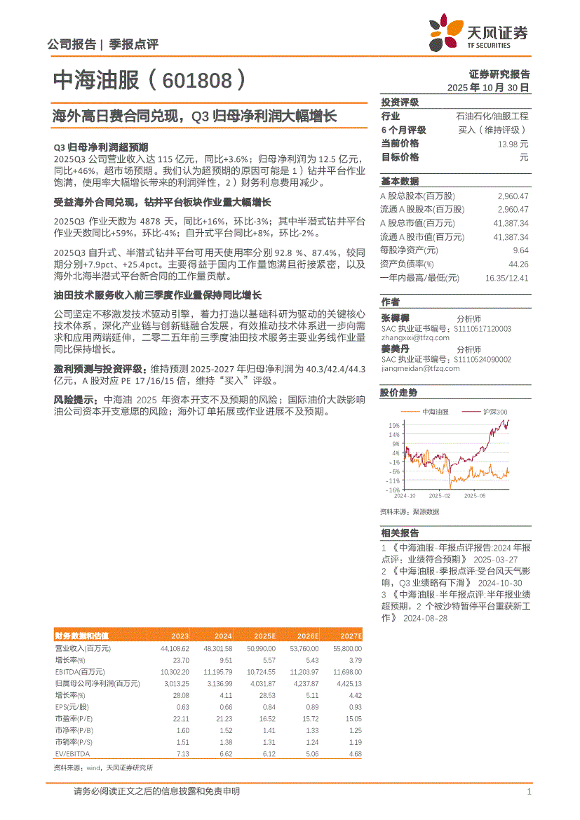 中海油服:天风证券-中海油服-601808-海外高日费合同兑现,Q3归母净利润大幅增长-251030