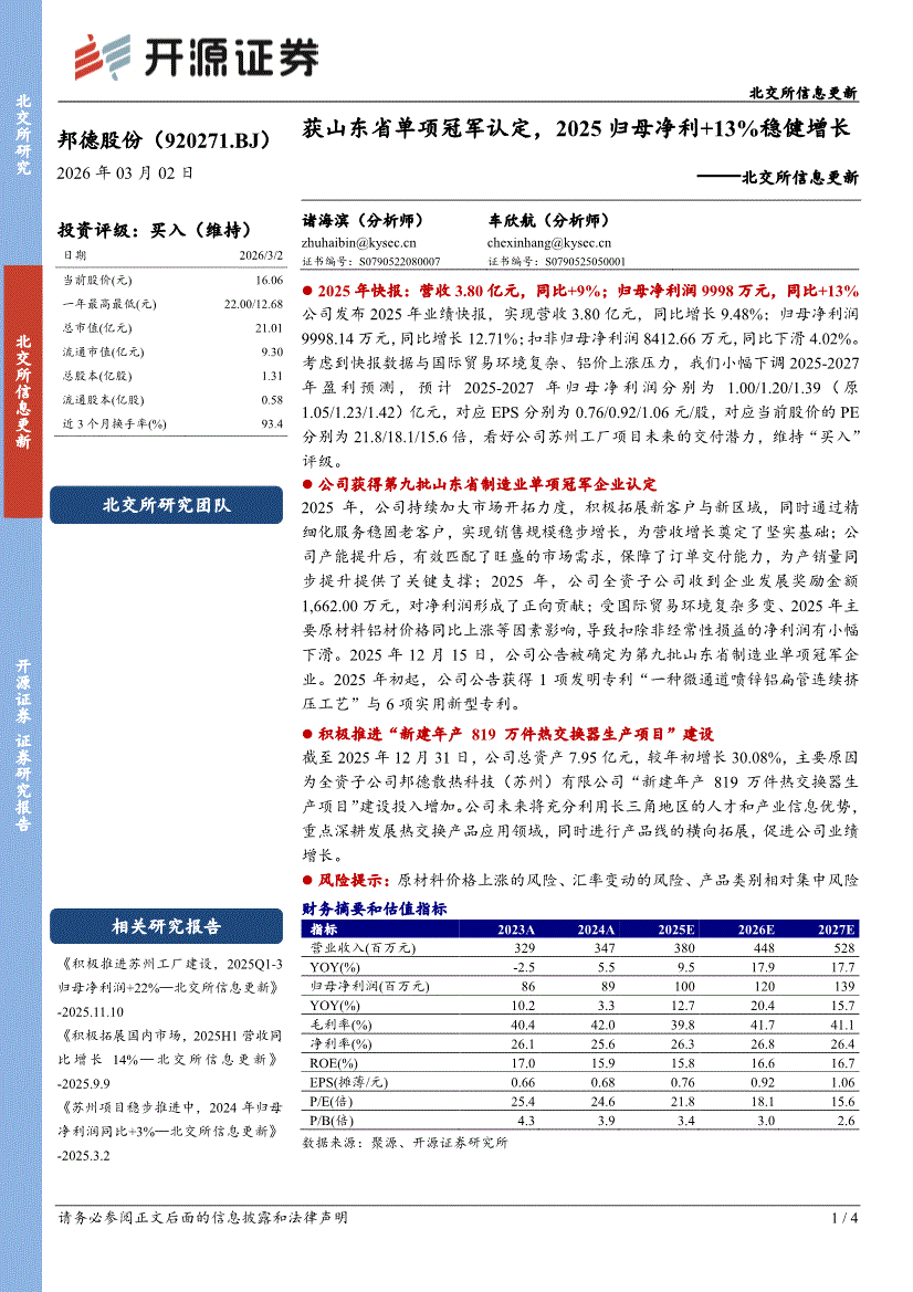 邦德股份:开源证券-邦德股份-920271-北交所信息更新:获山东省单项冠军认定,2025归母净利+13%稳健增长-260302