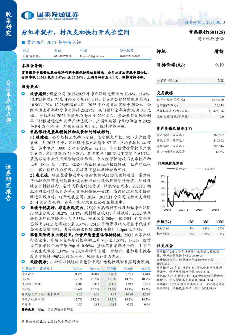 常熟银行:国泰海通证券-常熟银行-601128-2025半年报点评:分红率提升,村改支加快打开成长空间-250813