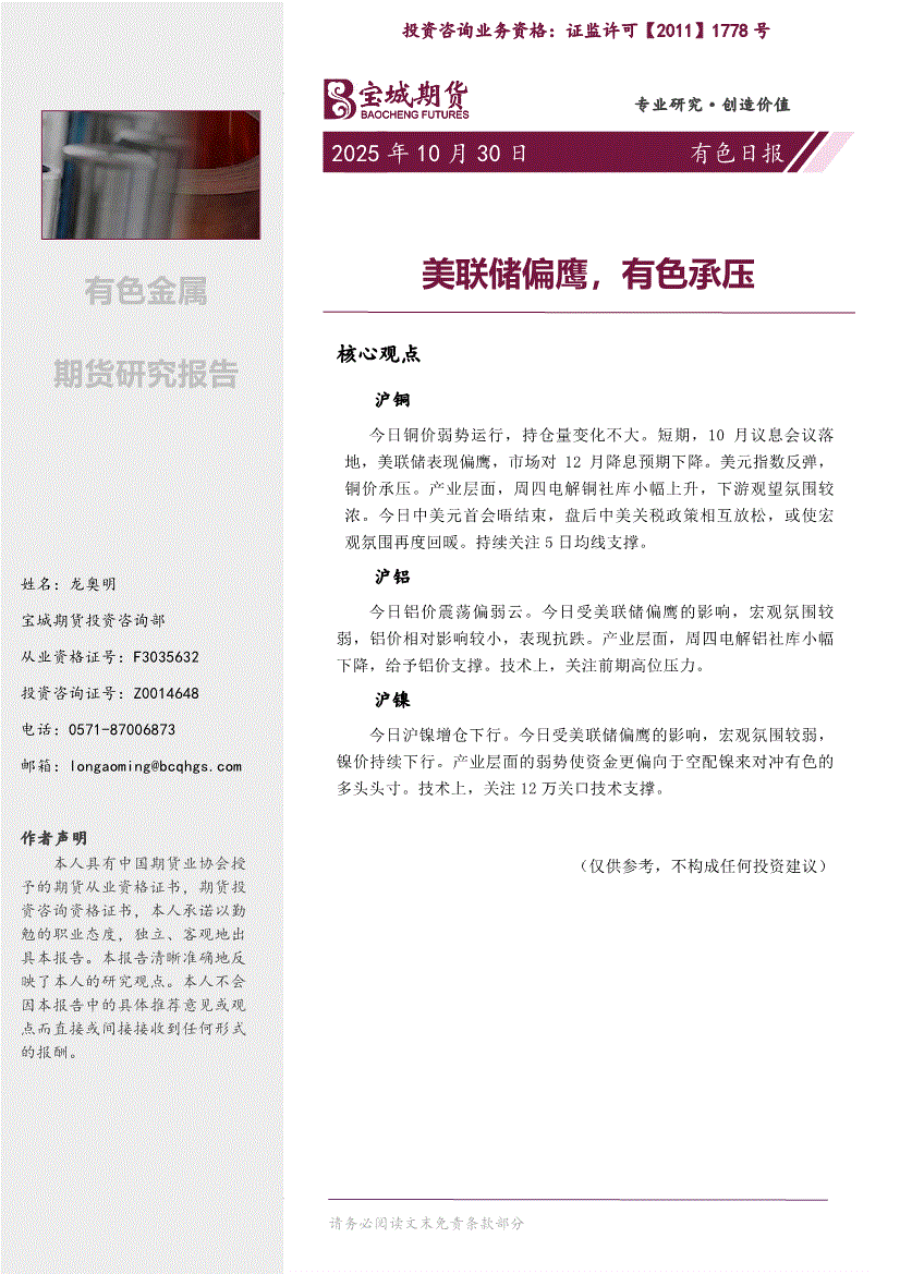 宝城期货-有色日报:美联储偏鹰,有色承压-251030