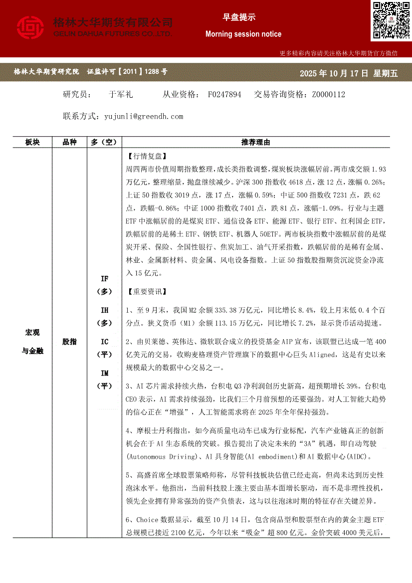 格林大华期货-一周简评:上证指数越过3900点,创10年新高-251010