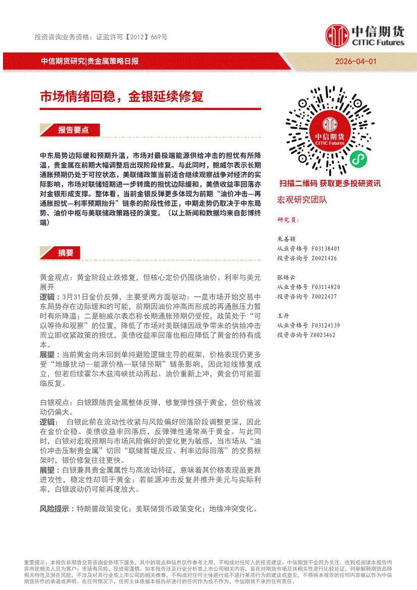 中信期货-贵金属策略日报:市场情绪回稳,金银延续修复-260401