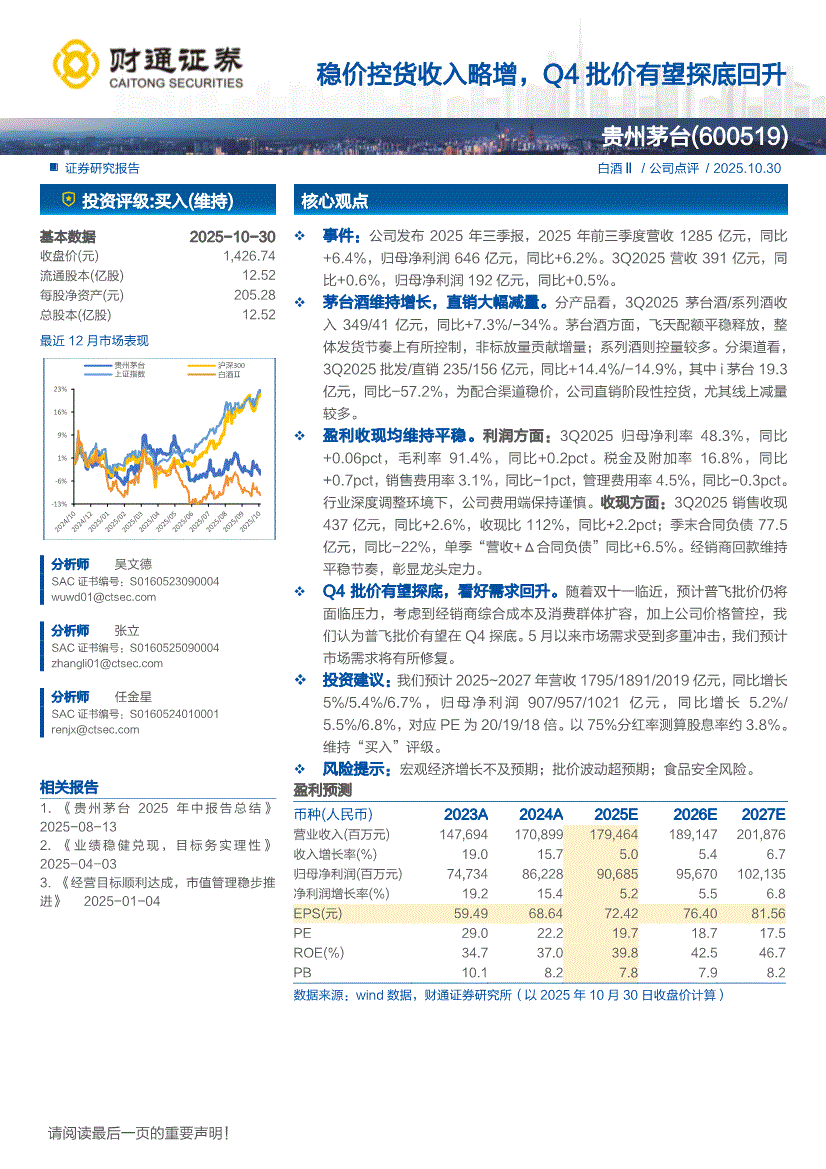 贵州茅台:财通证券-贵州茅台-600519-稳价控货收入略增,Q4批价有望探底回升-251030