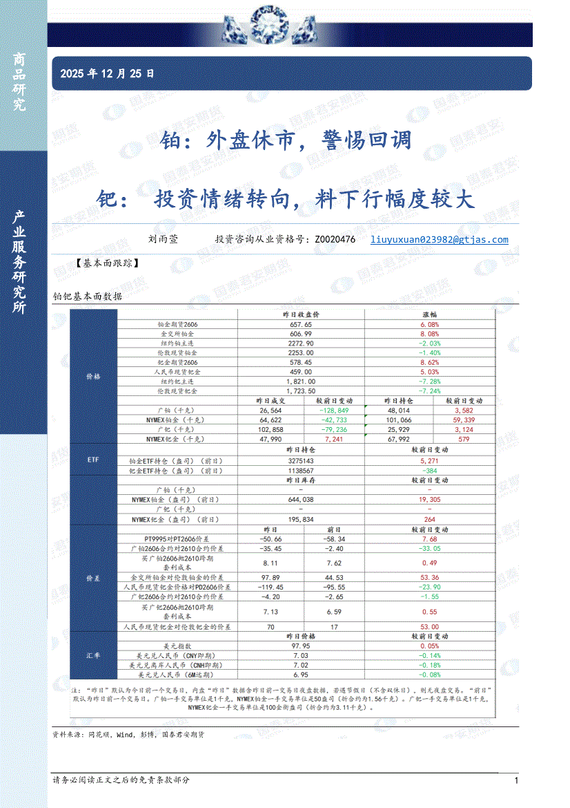 国泰君安期货-铂:外盘休市,警惕回调,钯,投资情绪转向,料下行幅度较大-251225