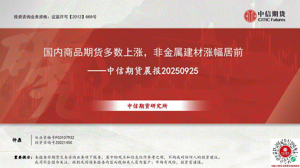 中信期货-晨报:国内商品期货多数上涨,非金属建材涨幅居前-250925
