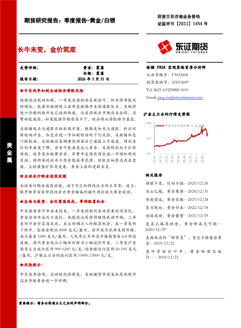 东证期货-期货研究报告:季度报告~黄金/白银,长牛未变,金价筑底-260331