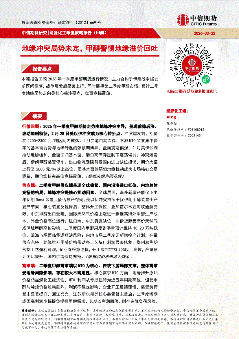 中信期货-能源化工季度策略报告(甲醇):地缘冲突局势未定,甲醇警惕地缘溢价回吐-260322