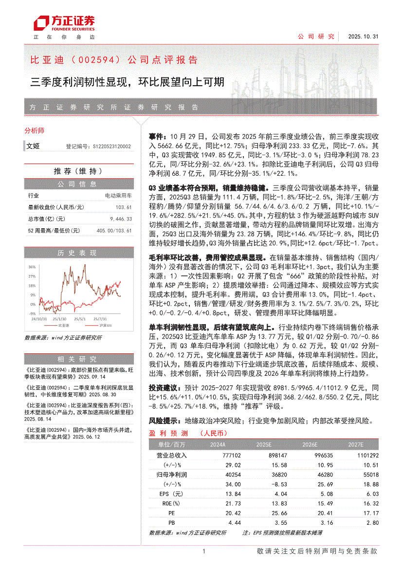 比亚迪:方正证券-比亚迪-002594-公司点评报告:三季度利润韧性显现,环比展望向上可期-251031