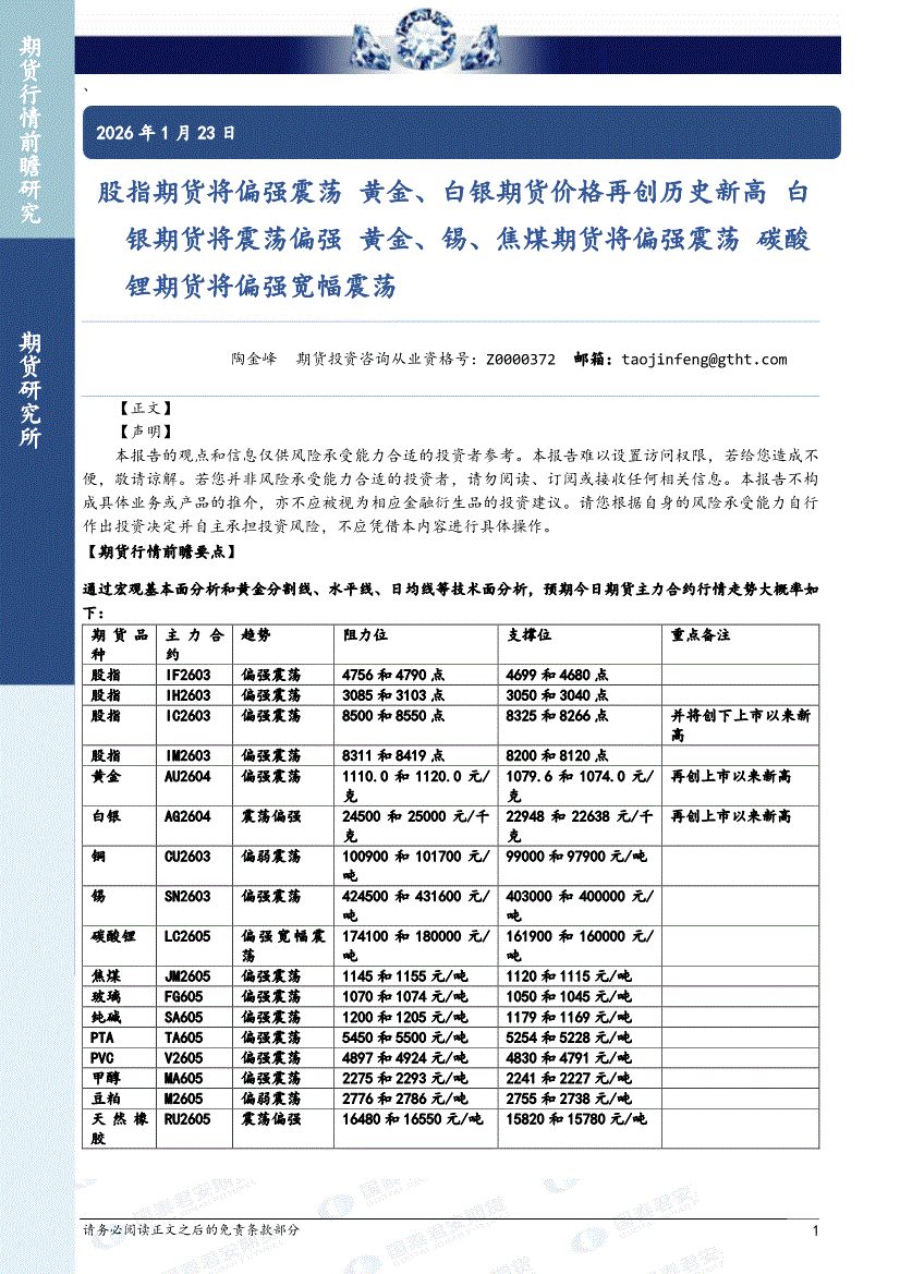 国泰君安期货-股指期货将偏强震荡,黄金、白银期货价格再创历史新高,白银期货将震荡偏强,黄金、锡、焦煤期货将偏强震荡,碳酸锂期货将偏强宽幅震荡-260123