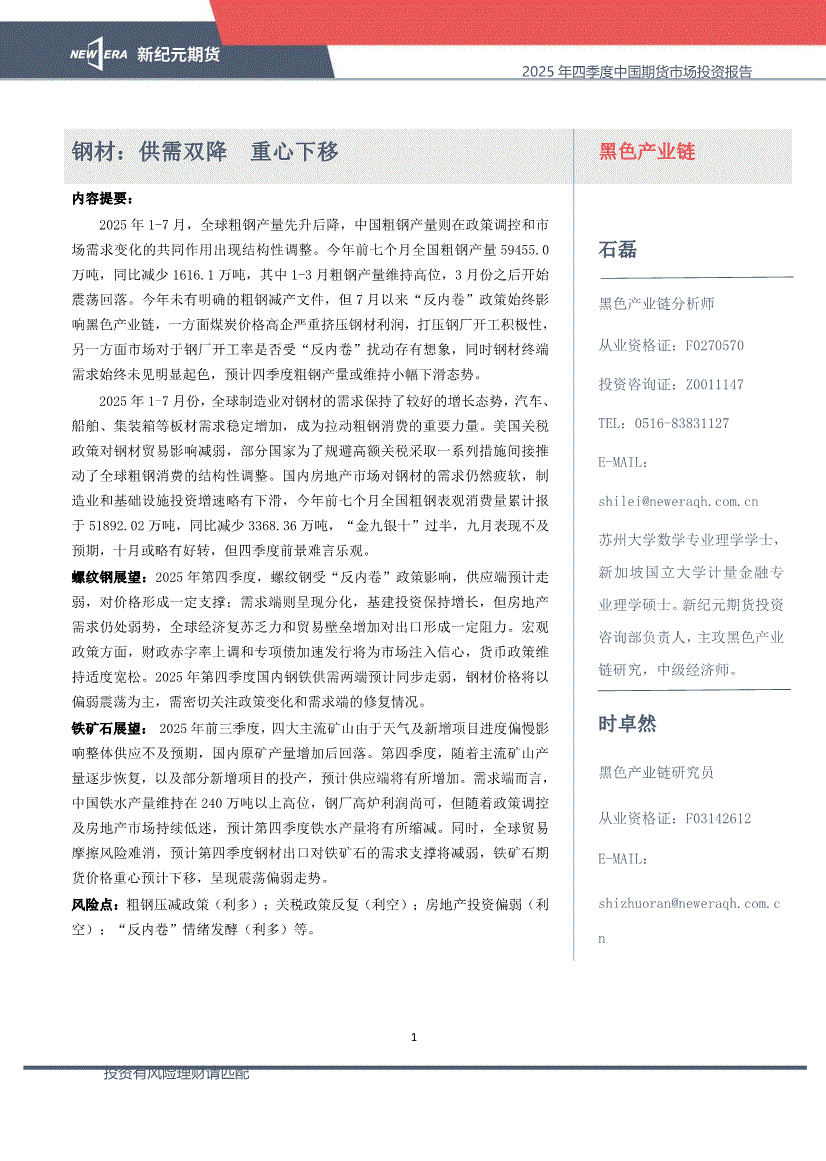 新纪元期货-2025年四季度中国期货市场投资报告:钢材,供需双降重心下移-250925