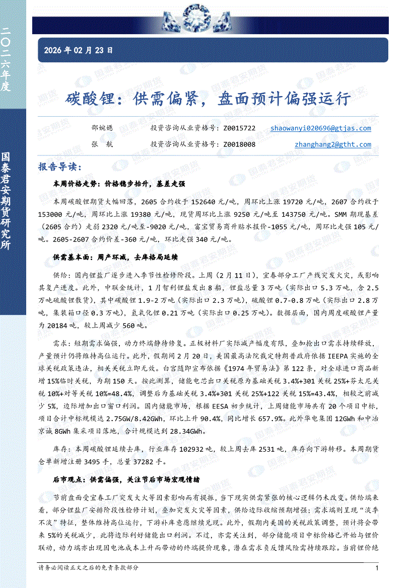国泰君安期货-碳酸锂:供需偏紧,盘面预计偏强运行-260223