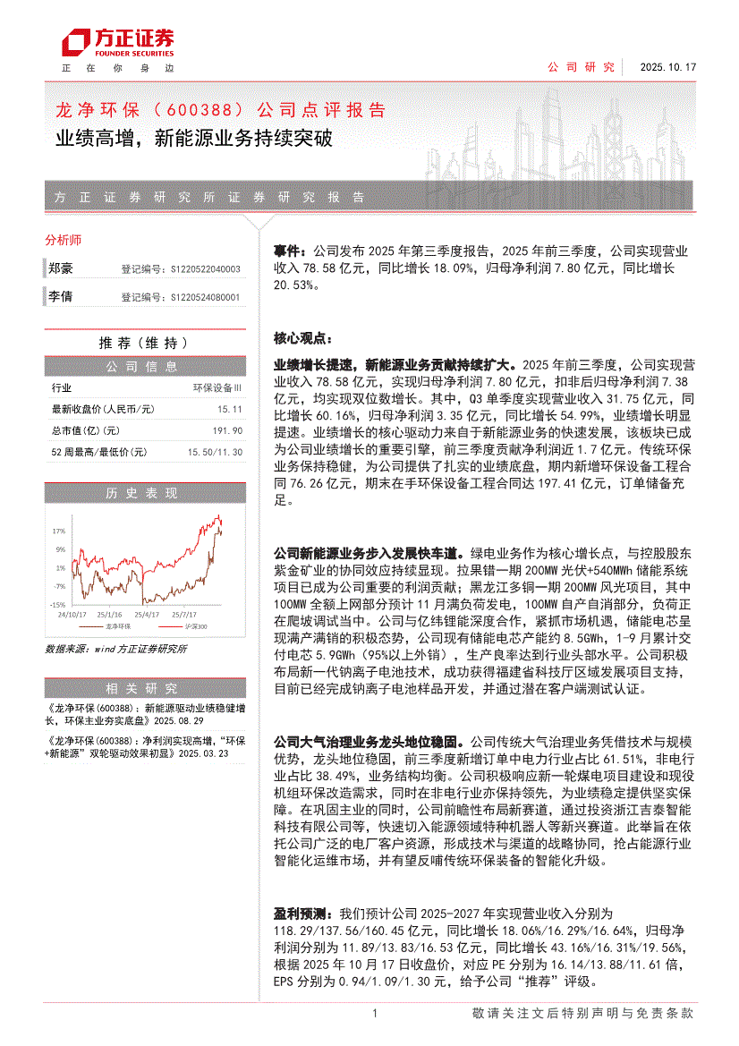 龙净环保:方正证券-龙净环保-600388-公司点评报告:业绩高增,新能源业务持续突破-251017