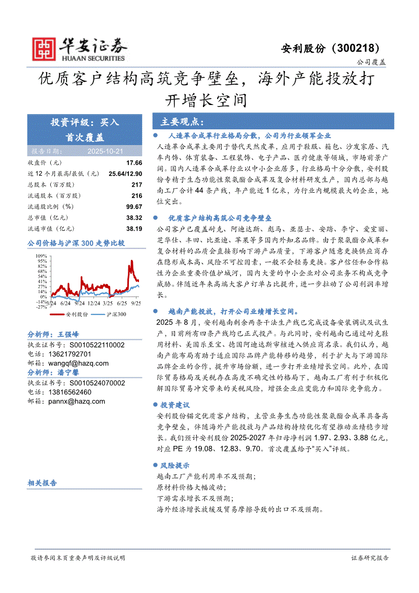 安利股份:华安证券-安利股份-300218-优质客户结构高筑竞争壁垒,海外产能投放打开增长空间-251021