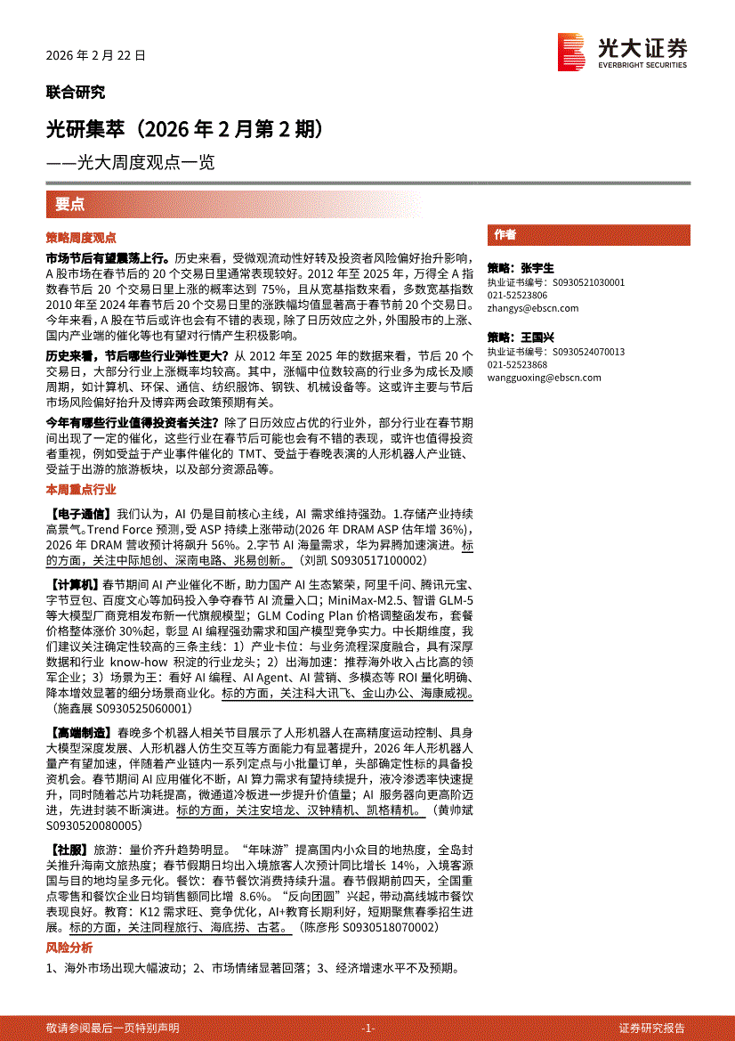 光大证券-光研之声2026年2月联合月报:聚焦热点,持股过节-260201