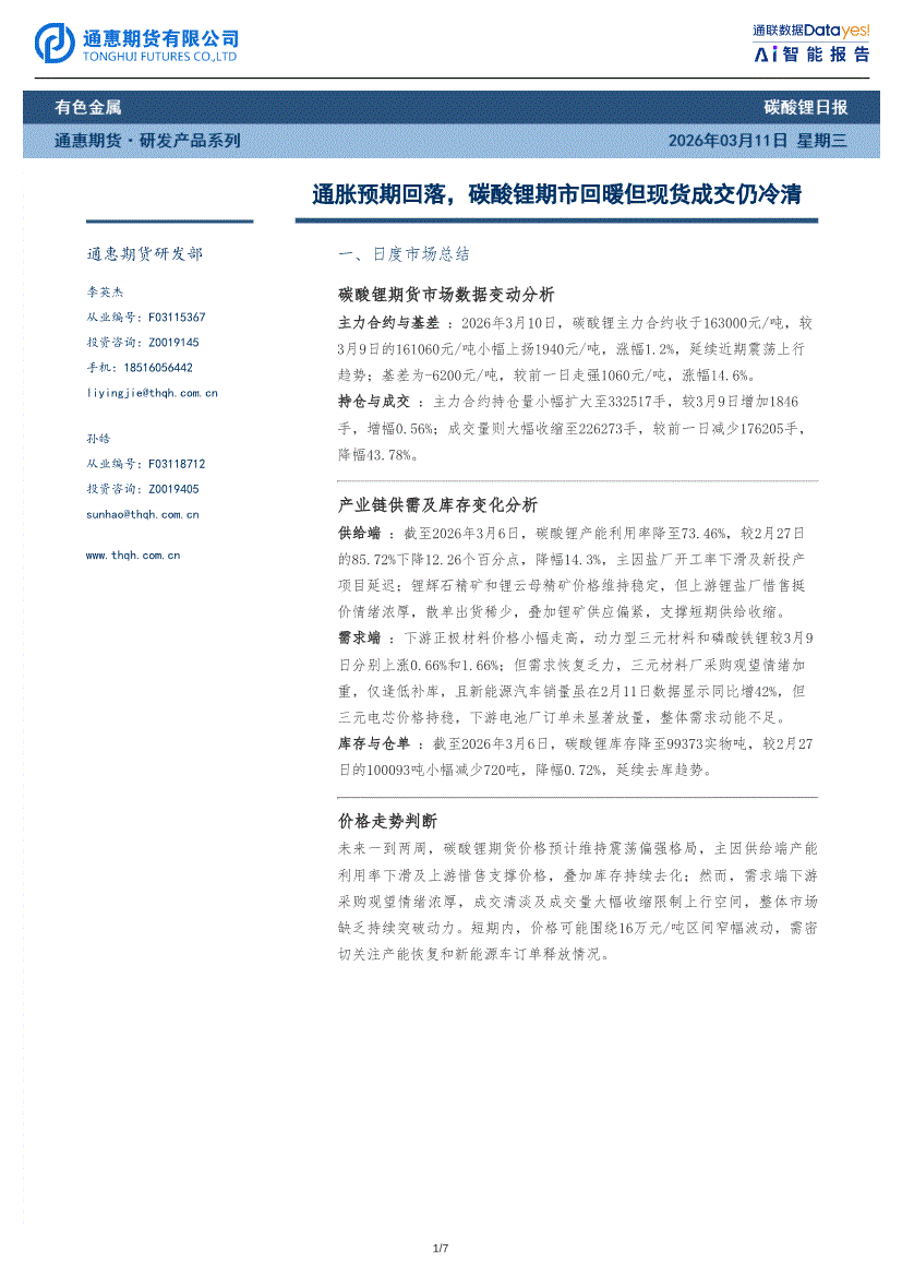 通惠期货-碳酸锂日报:通胀预期回落,碳酸锂期市回暖但现货成交仍冷清-260311
