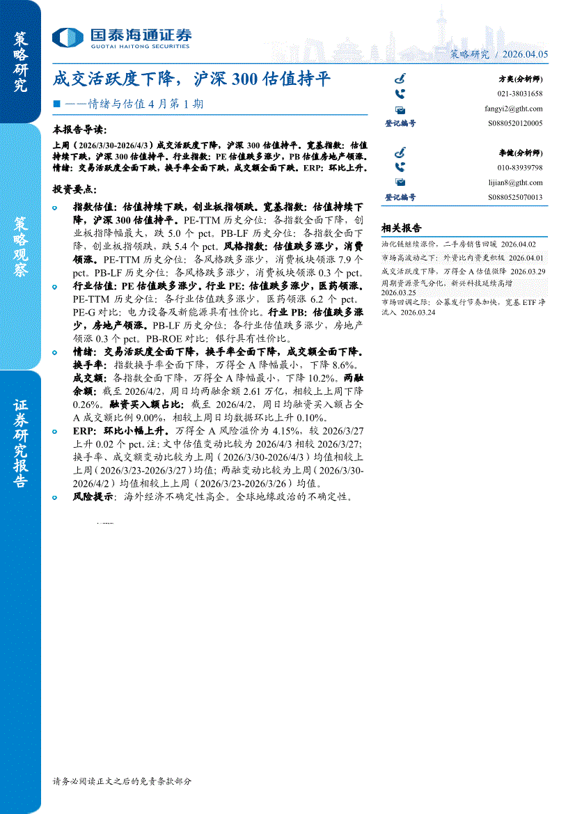 国泰海通证券-情绪与估值4月第1期:成交活跃度下降,沪深300估值持平-260405