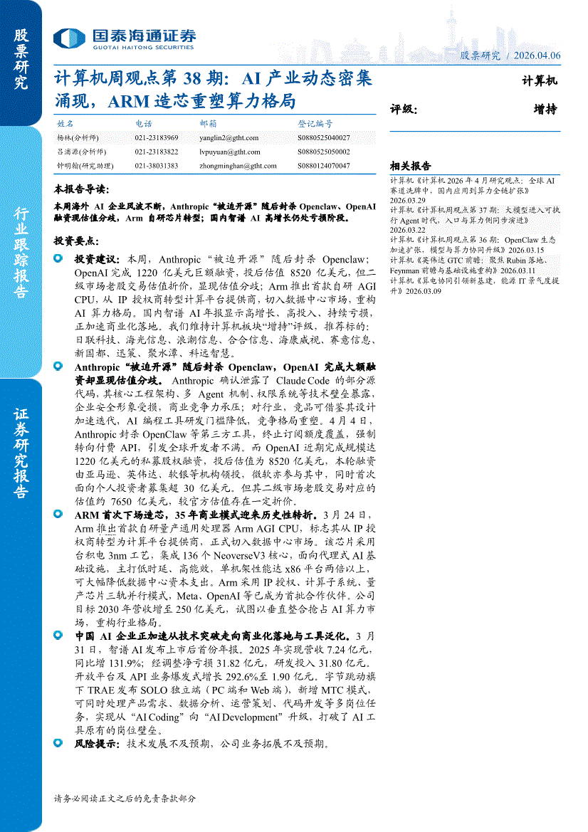 计算机行业:国泰海通证券-计算机行业周观点第38期:AI产业动态密集涌现,ARM造芯重塑算力格局-260406