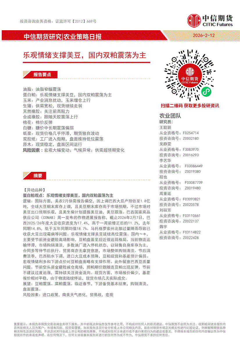 中信期货-农业策略日报:乐观情绪支撑美豆,国内双粕震荡为主-260212