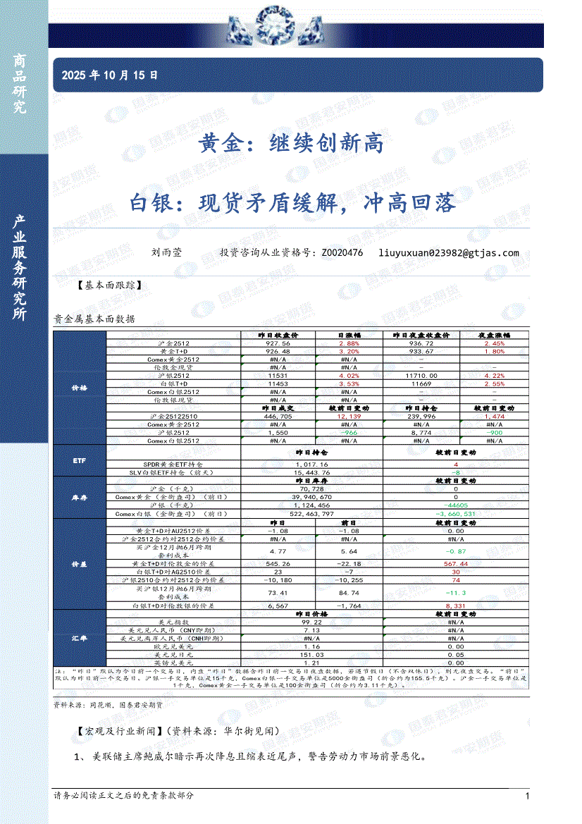 国泰君安期货-黄金:继续创新高,白银,现货矛盾缓解,冲高回落-251015